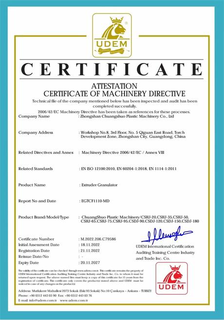 In 2022, Chuangshuo passed CE certification, Extruder Granulator